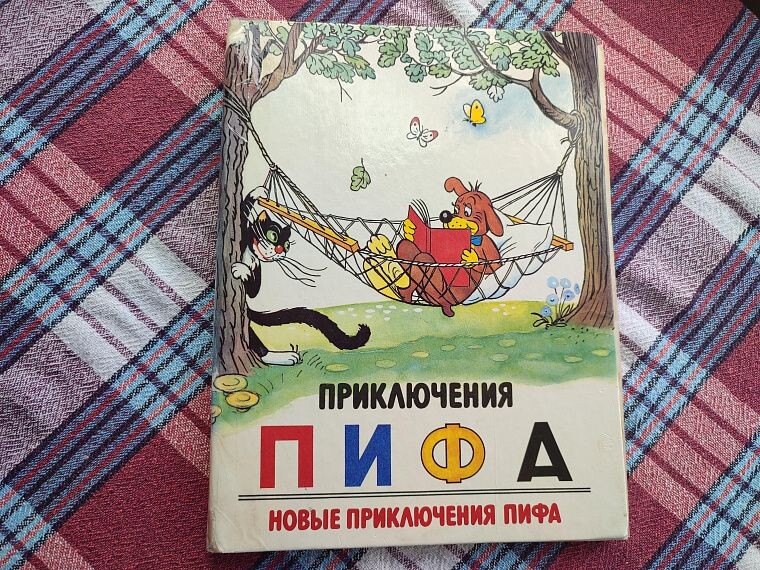 А вы в детстве читали комиксы? У меня была книжка «Приключения Пифа», на поиски которой я решила отправиться, когда сама стала мамой. Удалось ли мне отыскать тот самый экземпляр? В своё время мы с сестрой с огромным удовольствием рассматривать картинки про весёлого пса. Иногда нам было жалко Пифа, иногда кота Геркулеса. Мы даже мечтали пробраться в кино, хотя понимали, что нам это не удастся, нет у родителей такого длинного пальто, да и я не удержу сестру на плечах. А ещё выяснилось, что у мужа в детстве тоже была такая книжка. И тут, в один прекрасный день я увидела эту книжку в магазине. Почему я про неё забыла? Не знаю, сейчас иногда очень сложно вспомнить, что я читала, а свериться с той библиотекой детства уже нет возможности. Приходится по крупицам и отзывам восстанавливать забытое. Новая книга мне не понравилась, картинки не совсем те, описание другое. Оказывается, я действительно помню все те подписи к забавным картинкам. И я решила снова отправиться на поиски той книги из детс