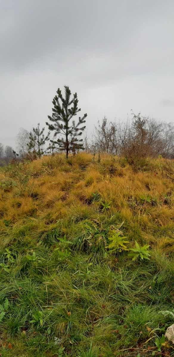 По случаю ледяного дождя пусто и просторно было на блестяще вымощенных аллеях. И все осенние краски под серым небом вдруг проявились как-то особенно ярко и мягко - как на сырой переводной картинке. Таков был и холм. Зелёный на склонах, но с рыжей макушкой, из которой дерзко тянулась ввысь молодая сосновая поросль.