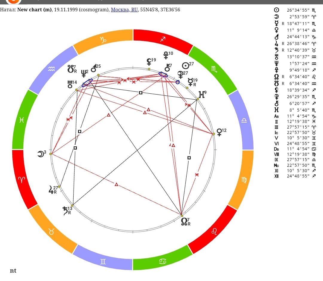 Евгения Армановна Медведева (Бабасян) родилась 19 ноября 1999 г. В городе г. Москва , Россия, время рождения, к сожалению , не известно , поэтому будем рассматривать ее космограмму