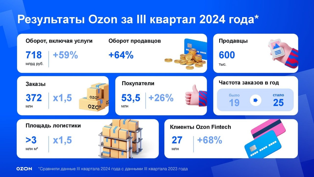 — Активных покупателей стало на 11 млн больше, чем год назад — теперь у Ozon 53,5 млн клиентов. В среднем каждый из них делает 25 заказов в год — вместо 19 в 3 квартале 2023 года. Как видите, не только привлекаем новых клиентов, но и работаем над лояльностью текущих.