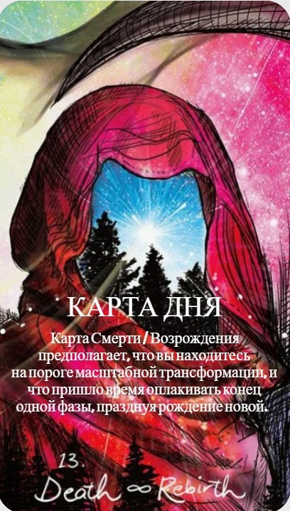 Карта Смерти / Возрождения предполагает, что вы находитесь на пороге масштабной трансформации, и что пришло время оплакивать конец одной фазы, празднуя рождение новой.