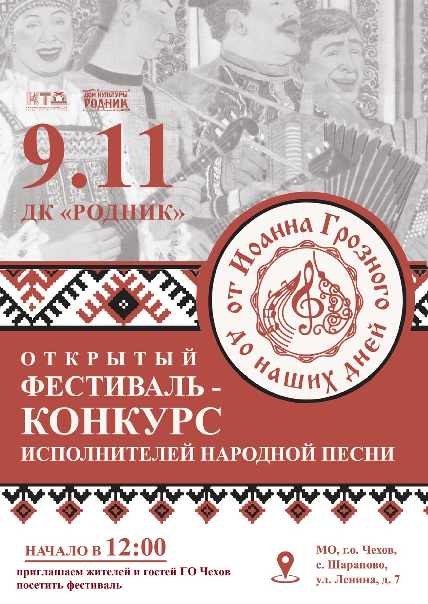 💥 Открытый фестиваль-конкурс исполнителей народной песни "От Иоанна Грозного до наших дней" Всех ценителей народной песни мы приглашаем в эту субботу в зрительный зал Дома культуры "Родник" на Открытый фестиваль-конкурс исполнителей народной песни "От Иоанна Грозного до наших дней". Со сцены прозвучат лирические, плясовые, зажигательные русские народные песни. Участники конкурса поделятся теплом своей души и зарядят каждого зрителя волной позитива. С нетерпением ждем Вас! 🚫 Возраст: 0+ 📆 09.11.2024 🕕 12:00 🏢 ДК «Родник» 📍 г.о. Чехов, с. Шарапово, ул. Ленина, д.7 #ДКРодник #Шарапово #КТД #ГоспабликиМО #ГородскойОкругЧехов