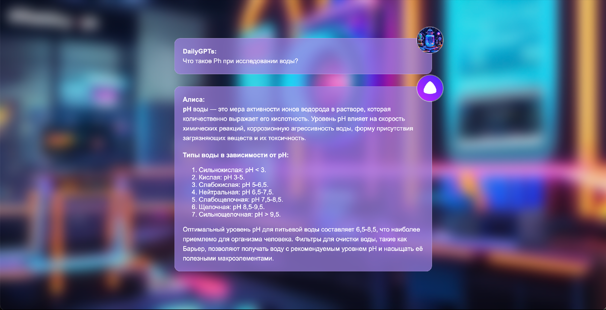 Бытовой вопрос про исследования качества воды. Что измеряют различные приборы и тесты. Самый популярный параметр это "Ph". Так что же это такое? Раньше нужно было идти в поисковик, писать запрос. При этом нужно было так его составить, чтобы нашлось совпадение фразы на одном из сайтов. Да, падежи или численность можно было нарушать, благо поисковики это учитывали. Чем точнее было совпадение, тем быстрей мы находили нужный ответ. Но при этом нам требовалось открыть один или несколько страниц, среди большего количества текста вычитать нужный нам ответ. Борьба с рекламой на сайтах, регистрация, ответа не оказалось.... Много было всякого. Теперь же у многих под рукой есть Алиса. Она живет в станциях, телевизорах и т.д. Именно поэтому мы решили начать с Алисы, она самая популярная в наших широтах и к ней проще всего обратиться. Напоминаем, что это лишь пример, того что можно спросить. Можно спросить про любой другой показатель воды. Можно спросить значение консервантов с упаковки молока и т.