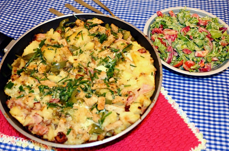 А ещё это блюдо прозвали «крестьянский завтрак». Основу его составляют жареное мясо, отварной картофель, яйца и бекон. К этому можно добавить, что есть на кухне: зелень, перец, лук, огурцы, грибы. Немецкие бюргеры любят Хоппель Поппель с жареным болгарским перцем или маринованными огурцами.