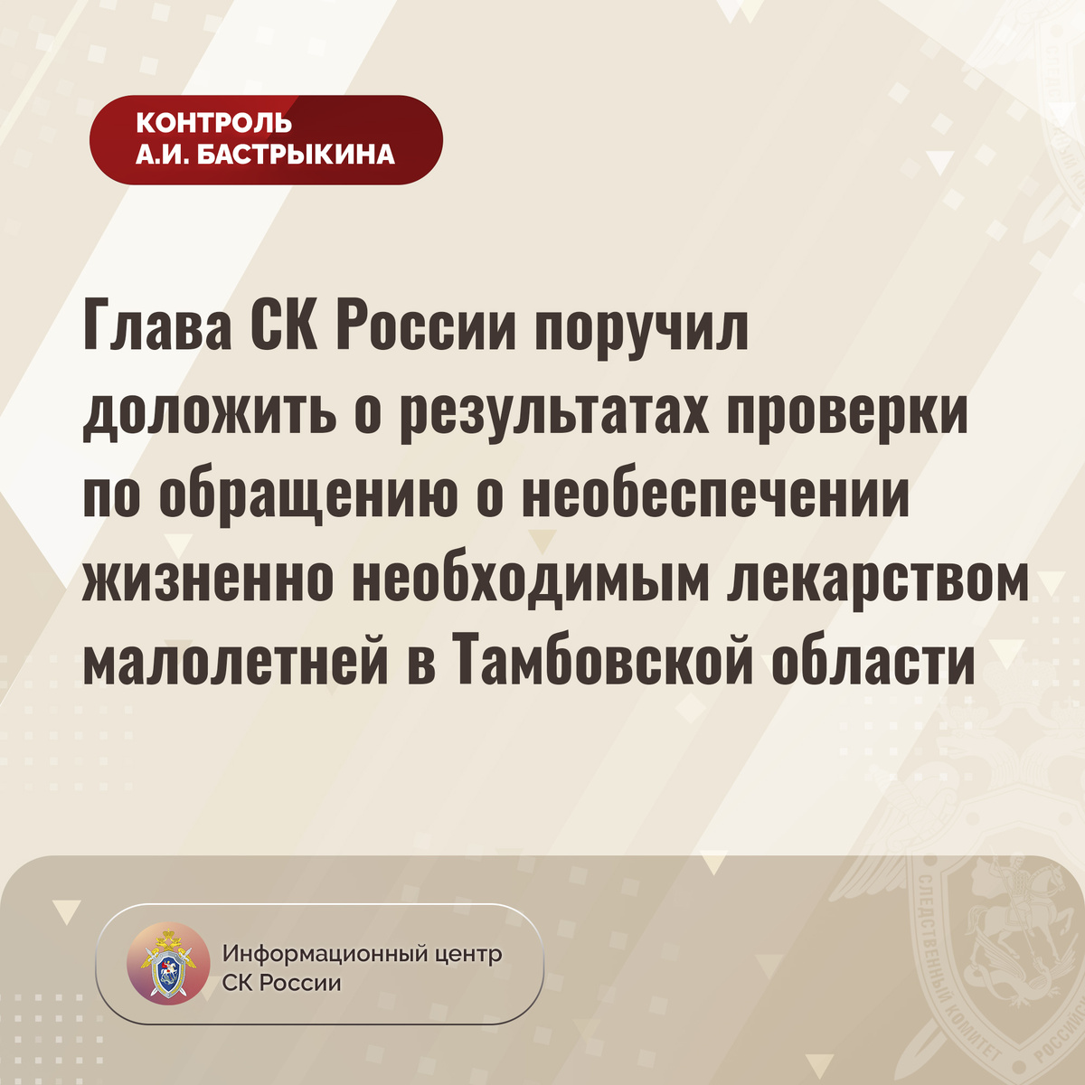 Глава СК России поручил доложить о результатах проверки по обращению о необеспечении жизненно необходимым лекарством малолетней в Тамбовской области В комментариях в аккаунте приёмной Председателя СК России А.И. Бастрыкина «ВКонтакте» обратилась жительница Тамбовской области по вопросу длительного необеспечения ее шестилетней дочери, являющейся инвалидом, жизненно необходимым лекарственным средством. Девочке назначен прием препарата, который по показаниям не подлежит замене на медикаменты с аналогичными свойствами. Однако на протяжении 8 месяцев выдача лекарства не осуществляется. Малолетней предлагается аналог, что может повлечь значительное ухудшение состояния ее здоровья. Многочисленные обращения в надзорный орган результатов не принесли. В СУ СК России по Тамбовской области по доводам комментария начата процессуальная проверка. Председатель Следственного комитета Российской Федерации Александр Иванович Бастрыкин поручил руководителю СУ СК России по Тамбовской области Александру Ник