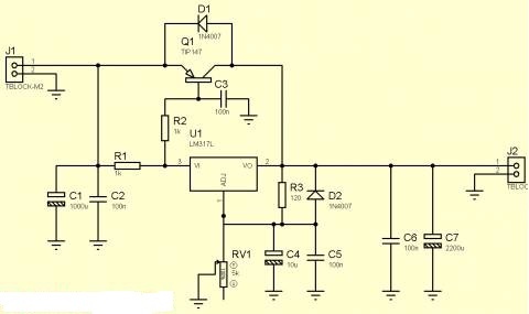 Универсальный блок питания, с помощью которого можно получить все напряжения, которые могут понадобиться в радиолюбительской и просто бытовой деятельности, должен быть в каждом доме. И конечно БП должен иметь хорошую мощность - обеспечивать ток выхода не 0,5 А, как у дешёвых китайских адаптеров, а несколько ампер, чтобы подключить даже свинцовые аккумуляторы от автомобиля для заряда, или электромоторы. Конечно при этом хочется чтоб диапазон напряжений так же имеет значение. Большинство схем блоков питания для начинающих ограничены 12 вольт, в лучшем случае 20. Но бывает нужно и 24, и 36 В. Сложно ли создать такой БП самому? Нет, ведь для схемы понадобится всего лишь десяток деталей. Вот очень простой, универсальный источник питания с регулируемым напряжением питания. Максимальное выходное напряжение 36 В - оно настраивается в диапазоне от 1,2 до (vcc - 3) вольт. Транзистор Q1 - это мощный PNP Дарлингтон, используется для увеличения тока микросхемы LM317. Сама LM317L без ра