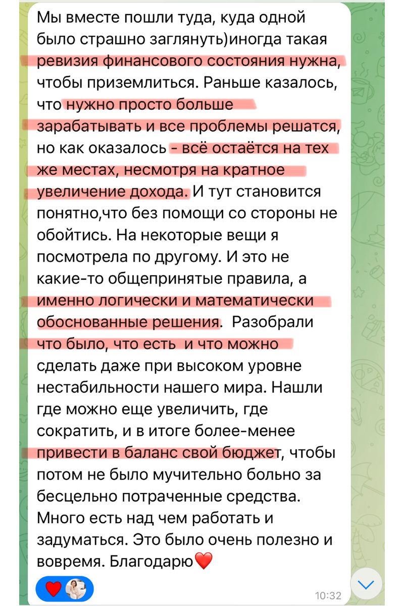 Это отзыв о финансовой консультации в рамках коучинового пакета☝️ Я уже давно вынашивала идею о группе по финансам, где я смогла бы дать рабочие инструменты о пути к финансовой независимости, поделиться своим опытом и собрать вокруг себя клевых людей. Какой формат работы? Уже создана группа в телеграм, в рамках которой я буду делиться материалами и готовыми таблицами, записывать небольшие аудиоподкасты и еженедельно мы будем собираться и обсуждать, что получилось. Ну и, конечно, общаться в чате. Что будем делать? - Анализировать активы и пассивы - Ставить финансовые цели - Считать размер подушки безопасности - Составлять личный бюджет - А еще просчитаем сколько вам нужно наоткладывать для достижения финансовой независимости Короче, делать 😉 А если мне не понравится? Если по истечении недели вы понимаете, что Вам не нравится, я верну деньги в полном объеме. А если это будет непонятно, сложно и я вообще ничего не пойму? Для этого есть чат и еженедельные разборы. Это не квантов