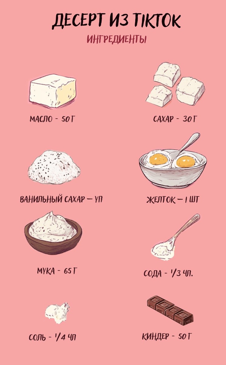 На этой неделе в гости на чай, а так же на интервью в шоу «Торт в лицо» пришла новая солистка группы «Город 312» Диана Макарова. Девушка рассказала о том, как попала в группу, раскрыла секреты шоу «Голос» и поделилась фактами о себе. В выпуске, ведущая с гостьей готовили «Десерт из TIKTOK». Как его готовить, смотрите ниже: Ингредиенты: Маслo — 50г Сахар — 30г Ванильный сахар —1 уп. Желток — 1 шт. Мука — 65г Сода — 1/з чл Соль — 1/4 чл Киндер — 50г Рецепт: Смешиваем растопленное масло с сахаром и ванильным сахаром, перемешиваем. Добавляем желток и перемешиваем. Засыпаем муку, соль и соду. Затем снова добавляем муку. Перемешиваем и добавляем киндер. Выкладываем в круглую форму и сверху посыпаем остальной частью киндера. Убираем в духовку на 14-17 минут на 170 градусов. Всего за час вы приготовите вкусняшку для посиделок с друзьями. Приятного аппетита!