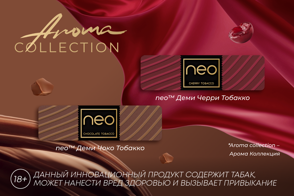 Мы расширили нашу линейку стиков сразу двумя новыми предложениями – neo Деми Черри Тобакко и neo Деми Чоко Тобакко из коллекции AROMA COLLECTION, созданной для тех, кто ценит запоминающиеся ароматы и табак высокого качества. Вкусы вишни и шоколада – многогранны и интересны, они не теряют своей актуальности уже много лет. Вдохновившись этим неопровержимым фактом, мы разработали стики neo Деми Черри Тобакко и neo Деми Чоко Тобакко — бленды из премиального табака, дополненные утонченными нотами вишни и шоколада. Стики neo AROMA COLLECTION предлагают яркие вкусовые сочетания. Каждая деталь упаковки и самих стиков продуманы для того, чтобы вы могли погрузиться в атмосферу яркой ароматики абсолютно во всем. neo AROMA COLLECTION — это, в первую очередь, возможность открыть для себя новые грани вкуса и аромата, создавая яркие моменты в течение всего дня. Мы использовали 100%-й табак и добавили к нему две уникальные вкусовые ноты. neo Деми Черри Тобакко и neo Деми Чоко Тобакко — это сочетание н