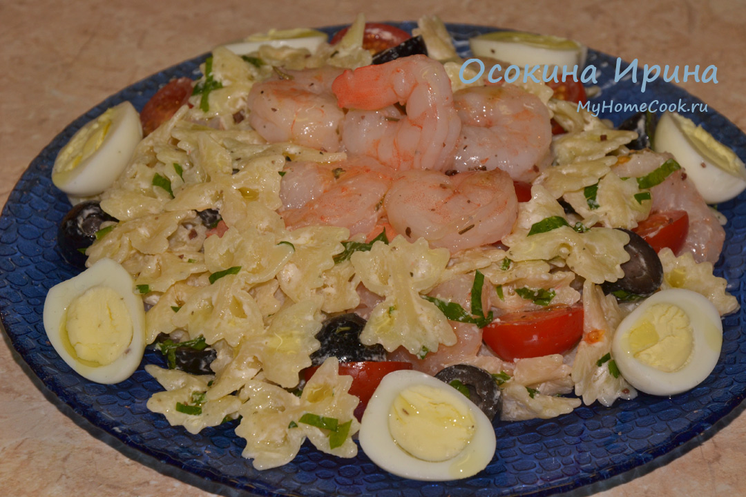 Сегодня вместо основного блюда решила приготовить тёплый салат из макаронных изделий. Это быстрее, чем готовить пасту и разнообразнее по вкусовым добавкам. Отварила 150 г мини-фарфалле (маленьких бабочек) и откинула на дуршлаг, затем сразу вернула в кастрюлю, добавила 2 ст.л. творожного сыра, промешала до его растворения, затем добавила пару ложек оливкового масла и ещё раз промешала, добавила пару горстей резных пополам маслин, дюжину помидорок черри половинками, хорошую горсть рубленной петрушки, посолила и промешала, затем добавила 150 г маринованных в пряностях креветок из пресервов, снова промешала, разложила по тарелкам, вокруг обложила половинками отварных перепелиных яиц, присолила, полила оливковым маслом и сразу подала, пока салат тёплый. Очень вкусно, ну ооочень) Приятного аппетита