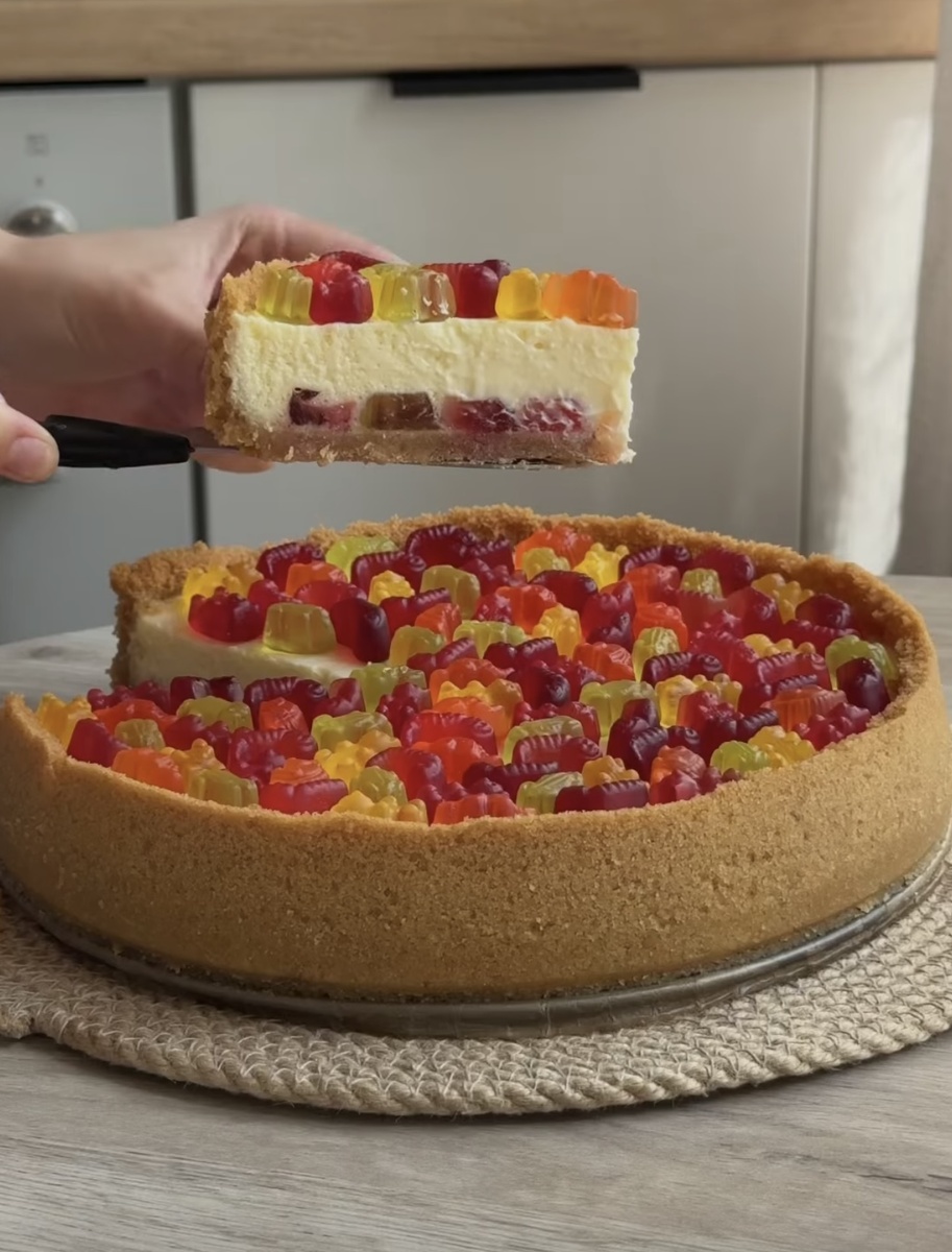 2. Достаем форму с основой из печенья и выкладываем желе мармеладные конфеты разных цветов, чтобы создать яркий и веселый вид.