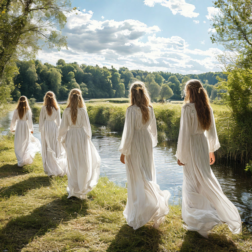 Я оказалась на на полянке возле берега нашей реки. Ко мне приблизились много женщин. Все они были одинаковые, в светлых длинных одеждах с разной вышивкой белого, золотого и других цветов. Они встали вокруг меня, а я опустилась на траву. Земля была тёплая, летняя, я ощущала ее плотность, всё было на самом деле. Я слышала шум природы вокруг. Сначала хотелось, чтобы я была в этом месте одна, никаких городов, сёл, людей, только я.