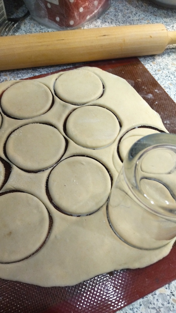 Когда тесто готово, нужна скалка хорошая и силушка богатырская, чтобы из маленького кусочка теста блин большой раскатать. Потом стаканом кружочки навырезать, ну, вы это знаете, и после этого начинается рукоприкладное творчество.