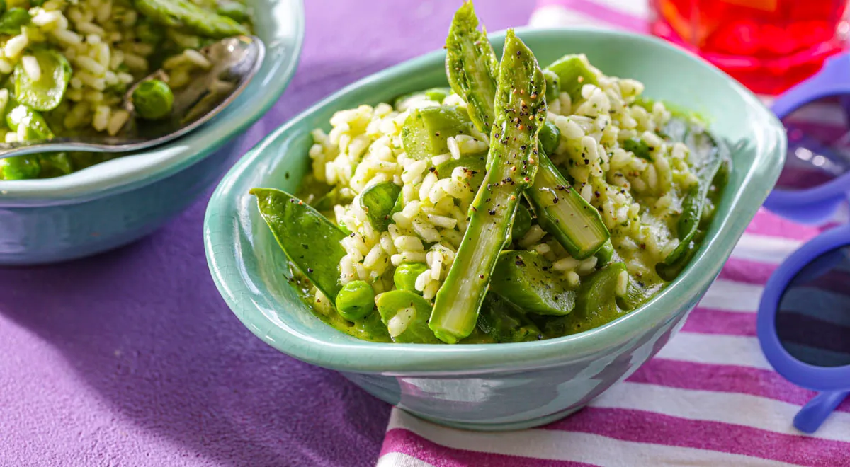 Ризотто со спаржей, зелёным горошком и пармезаном — это лёгкое и одновременно сытное блюдо, которое идеально подойдёт как для обеда, так и для ужина.
