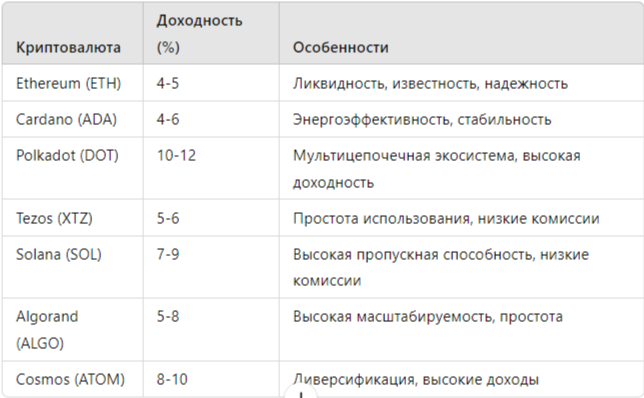 Выбор криптовалюты для стейкинга зависит от нескольких факторов, включая доходность, ликвидность и безопасность сети. Рассмотрим некоторые из наиболее популярных и перспективных криптовалют для стейкинга в 2024 году.