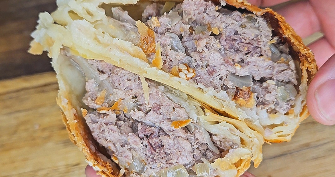 Рецепт : Вода 200мл Соль 1ч.л Мука 600гр Раскатать тесто Смазать маслом сливочным 200гр Убрать в холодильник на 2 часа Начинка: Фарш говяжий 600гр Лук репчатый 500гр Приправы по вкусу Смазать желтком Кунжут Выпекать при 180С 45 минут 2. 3. 9. 10. 11. 12.