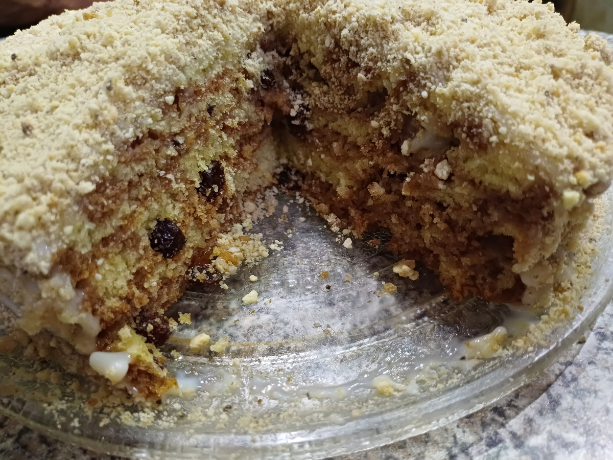 Взбить миксером 2 яйца с 1 стаканом сахара. В другую посуду влить стакан кефира добавить стакан манной крупы и размешать, чтобы не было комочков. Обе массы соеденить и перемешать.Добавить 100гр.растопленного сливочного масла или маргарина, по половине чайной ложки соли и соды,предварительно смешанной в 1 ст.муки,всыпать его в тесто и хорошо перемешать.Тесто получается густое, как сметана. Тесто разделить на две равные части в одну добавить 2 ст.ложки какао,а в другую или измельчённые орехи,или мак,или изюм. В смазанную форму выкладывать столовой ложкой поочерёдно тесто из мисок, пока не закроется дно формы. Выпечь в духовке до готовности.Так же выпечь следующие коржи,всего три коржа. Приготовить крем: взять 250 мл.молока,в половину стакана сахара всыпать 1,5 ст.л.муки,ванилин,хорошо перемешать. Молоко поставить на огонь.В тёплое молоко всыпать смесь муки и сахара,хорошо перемешать и нагреть до загустения.Снять с плиты добавить около 50 гр.сливочного масла перемешать и остудить.Остывш