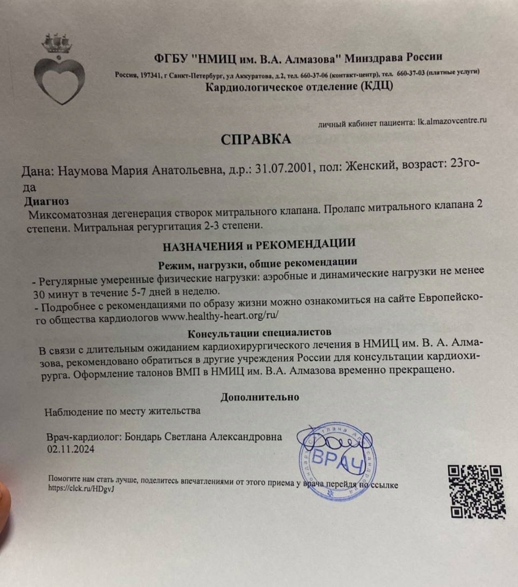 Не добившись нормального ответа с объяснением как она в МВД собралась оперироваться, отправила её в поликлинику по месту регистрации. Попросила позвонить в регистратуру и задать элементарный вопрос: "Что делать? Нужно вчера!" Она сидела в общежитие и грузилась неизвестностью. Требуется больница, которая ещё имеет квоту, которая может оперировать и которая может это сделать прямо сейчас. Приёма у кардиолога нужно ждать 2-3 недели. Посоветовала ей звонить в регистратуры и спрашивать. Для подачи через госуслуги нужна бумажка из Минздрава, а она даётся на основании консилиума врачей. Её лечащий врач не организовал это. Почему-то они там таким не занимаются, когда квоты закончились. Бумажку дали и иди сам ищи, а сестра ж не ищет! Врач поликлиники ранее из поликлиник в НМИЦ Алмазова послал. В поликлинике нет специалистов способных помочь с настолько серьёзной проблемой.
