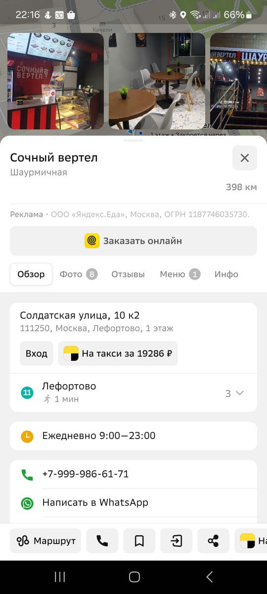 Когда были в Москве, жили в районе метро Лефортово. И вот, вечер, все устали и, естественно, проголодались. Недалеко от метро, прямо через дорогу, увидели кафе-шаурмичную "Сочный вертел". В Яндекс.Навигаторе у нее высокая оценка, решили зайти. И, скажу я вам, не прогадали. Внутри кафе маленькое: стойка с высокими стульями и 3 столика. Места прямо мало, но очень уютно и чистенько. Парень, который готовит, приятный, всё подскажет и поможет выбрать. А выбирать есть из чего! 9 видов шаурмы на любой вкус! Поострее, с сыром, с креветками... Кроме шаурмы есть еще и снеки (спасение для родителей с детьми, которые не едят шаурму) В общем, есть из чего выбрать. Цены приемлемые, по Московским меркам даже низкие. Теперь что касается вкуса. Мы часто покупаем шаурму, любим её. Есть с чем сравнить. Так вот, это кафе я однозначно рекомендую! Еда вкусная, качественная. Шаурма большая, много начинки. Мы кушали тут уже несколько раз. Уверена, придем еще. Будете в Москве в районе Лефортово, обяза