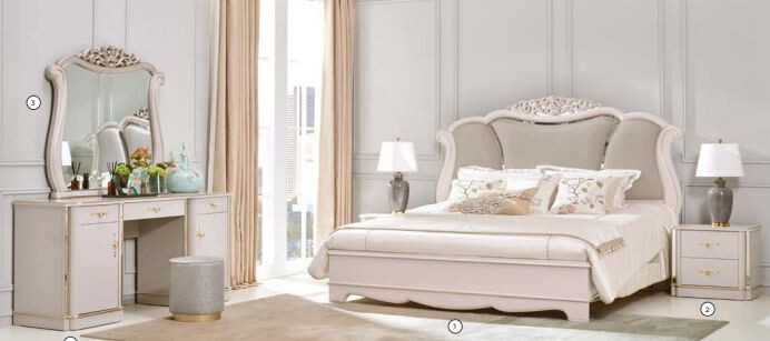 Представляем вам великолепный спальный гарнитур Paolina, произведенный в Китае. Этот изумительный комплект выполнен в сливочном цвете, дополняя атмосферу вашей спальни нежностью и изысканностью. Главным акцентом является изголовье кровати, украшенное массивным резным декором, что придает набору аристократичный вид. Светло-бежевое тканевое обивка кровати и изящная золотая фурнитура с кристаллами добавляют каждой детали шика и утонченности. Спальня гарнитур Paolina изготовлен из материалов высочайшего качества, таких как МДФ, эмаль, матовый глянец и патинирование в "золотых" тонах. Эти компоненты обеспечивают долговечность и надежность каждой единицы мебели, что особенно важно для создания комфортной и уютной атмосферы в вашей спальне. Этот модельный ряд предлагает удобные шкафы и комоды для хранения вещей. Шкаф шести-дверный с зеркалами станет не только практичным решением, но и стильным дополнением вашей спальни. Комод с пятью ящиками обеспечивает достаточно места для аккуратного хр