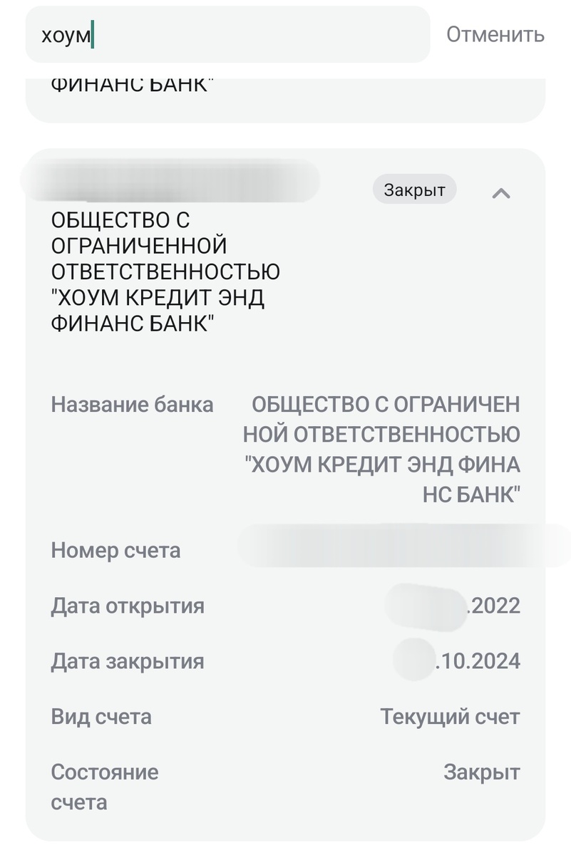 И вот наконец в ФНС видно, что счет тоже закрыт. Это значит, что приложение Хоум Банка тоже можно удалять - оно теперь бесплолезно.