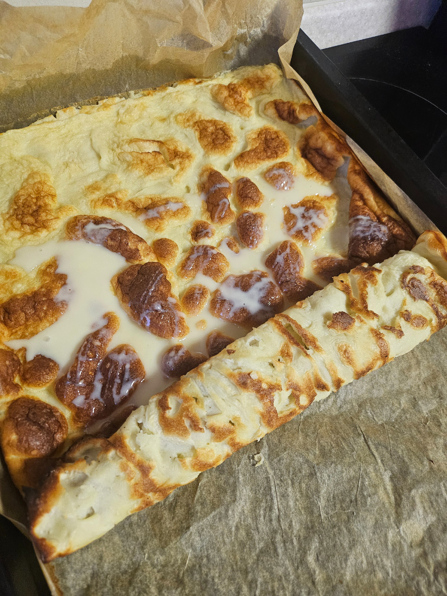 Рецепт попался в интернете случайно. Сохранила его на всякий случай. А в прошлое воскресенье, когда с утра у меня оказался кризис идей завтрака решила приготовить. Пока блин выпекался, начала читать комментарии к рецепту. И если честно, я начала уже расстраиваться. Блин называли "сладким омлетом" и "клёклым блином". Но отступать было не куда. В итоге я оказалась в восторге: это очень просто, быстро и вкусно. Домачатцам тоже понравилось. Съели и сказали, не будут против, если я решу ещё раз его испечь. Молоко 0,5 л Яйца 3 шт Масло сливочное 50 гр Сахар 2 ст. ложки Соль1/2 Чайных ложки Мука пшеничная 250 гр Взбиваем яйца с сахаром и солью до образования пены. Добавляем молоко и растопленное сливочное масло, размешиваем до однородной консистенции. После чего в яично-молочную смесь добавляем муку. Получается тесто похожее на жидкую сметану. В форму для запекания кладём пергамент, и на него уже выливаем тесто. Ставим в разогретую до 200 ° духовку на 20-25 минут. Когда блин готов, его мож