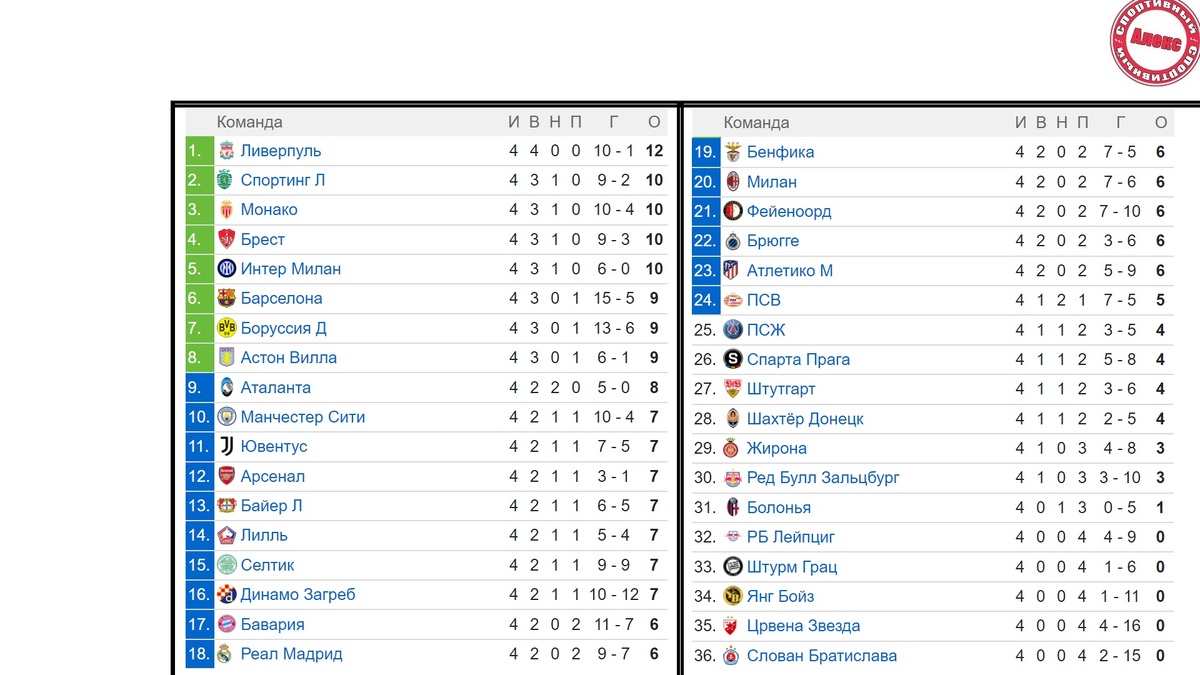 Сегодня, друзья, вас ждут абсолютно все результаты 4-го тура Лиги Чемпионов УЕФА. Шахтёр пытался добыть первую победу с аутсайдером Янг Бойз. Аутсайдер первым забил на 27-й минуте, воспользовавшись ошибкой обороны «горняков». Оранжево-черные ответили довольно быстро мячами Зубкова и Судакова (2:1). Швейцарцы получили 4-е поражение. Брюгге принимал непобеждённую Астон Виллу. Ванакен реализует пенальти и становится лучшим в матче. Удвоить счет имел шанс Джутгла. Итог 1:0. Первое поражение Астон Виллы. Таблицу увидим через минуту. Также это первая встреча в истории. Црвена Звезда, как и предполагали эксперты, уступила Барселоне. Мартинес открыл счет на 13-й минуте, Силас сравнял. Затем дважды забил Левандовски и расписался Фермин. Милсон немного скрасил счет на 84-й (2:5). Это седьмая победа каталонцев кряду по всех турнирах. Каждому из семи соперников Барселона забила не менее трёх мячей. Т.е. 3:0 – самый минимальный счет. Узнаю, прежнюю Барселону, а вы? Фейеноорд неожиданно уступил дом
