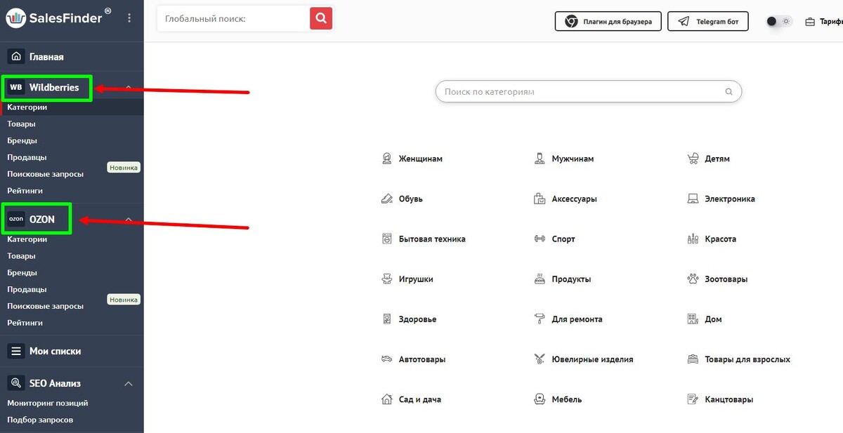 - Интеграция с различными платформами Salesfinder поддерживает работу с несколькими крупными российскими маркетплейсами, такими как Озон и Вайлдберриз. Это делает его универсальным инструментом для продавцов, работающих сразу на обоих платформах.