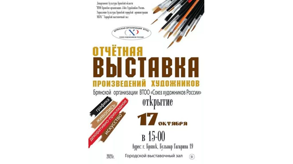 Осенняя отчётная выставка произведений региональной организации Союза художников России проходит в городском выставочном зале Брянска на бульваре Гагарина. Здесь более ста работ — живопись, графика, декоративно-прикладное искусство. Пейзажи, портреты, натюрморты. В экспозиции произведения, над которыми брянские художники работали в 2024 году. Среди участников, как молодые художники, вступившие в союз за последние годы, так и мастера, представлявшие содружество в годы его первых и последующих крупных успехов. Выставка завершает свою работу 10 ноября. 0+ В Брянске завершается отчетная выставка картин членов реготделения Союза художников России