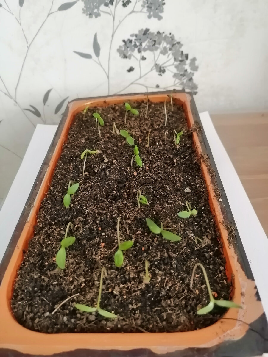 Попробую объединить в один материал опыт трех лет выращивания дидискуса. В нашем климате это растение однозначно однолетник. Вот тут мои теоретические изыскания, еще до попытки выращивания. А теперь опыт-сын. Всхожесть семян у меня все разы была хорошая - что покупных, что своих. Единственное, у меня свои семена всходят обычно чуть дольше, чем покупные. Причем я этот эффект отметила на всех культурах, чьи семена собирала и сеяла - что на дидискусе, что на кентрантусе, что на гауре. Если сеять в один день семена покупные и семена свои, то свои взойдут позже. Так выглядят всходы. Посев не поверхностный. Сейчас объясню, почему. Это помимо того, что вроде как он всходит в темноте. Собственно, уже на фотографии видно, что сеянцы легли и тянутся к свету. Так вот, они не просто тянутся. Они ОЧЕНЬ тянутся. Вот прямо до желания их немедленно схватить и засунуть поглубже в землю. Первые свои посевы я пересаживала минимум дважды, каждый раз пытаясь заглубить стебель. Потому что в открытом грунт