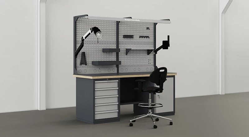 Для оборудования рабочего места сварщика также предусматривается подсветка рабочей поверхности стола. Для сваривания небольших изделий по периметру задействуется стол с вращающейся конструкцией. Он регулируется по высоте с помощью специальных винтов. Это позволяет выполнять опускание и подъем деталей для обеспечения удобства работы, за счет чего удается снизить уровень усталости.