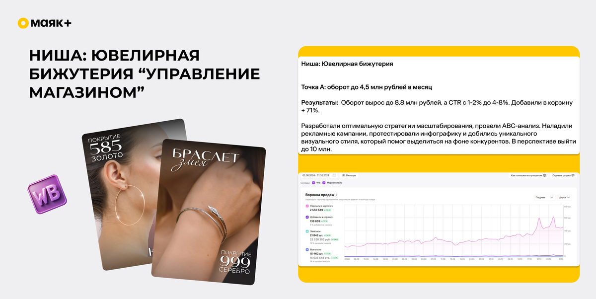 Маяк+ специализируется на том, чтобы решать именно такие задачи, помогая продавцам освоить и покорить маркетплейсы с максимальной выгодой. Недавно к нам обратился известный бренд ювелирной бижутерии. Уже имея успех, он хотел не просто поддержать текущий оборот, но значительно увеличить прибыль, наладить рекламу и добиться ещё большей узнаваемости. Наше сотрудничество началось 15 июля 2024 года и сразу нацелилось на рост. Какие шаги были сделаны, как мы справлялись с неожиданными трудностями, и что позволило удвоить оборот, об этом и пойдет речь.