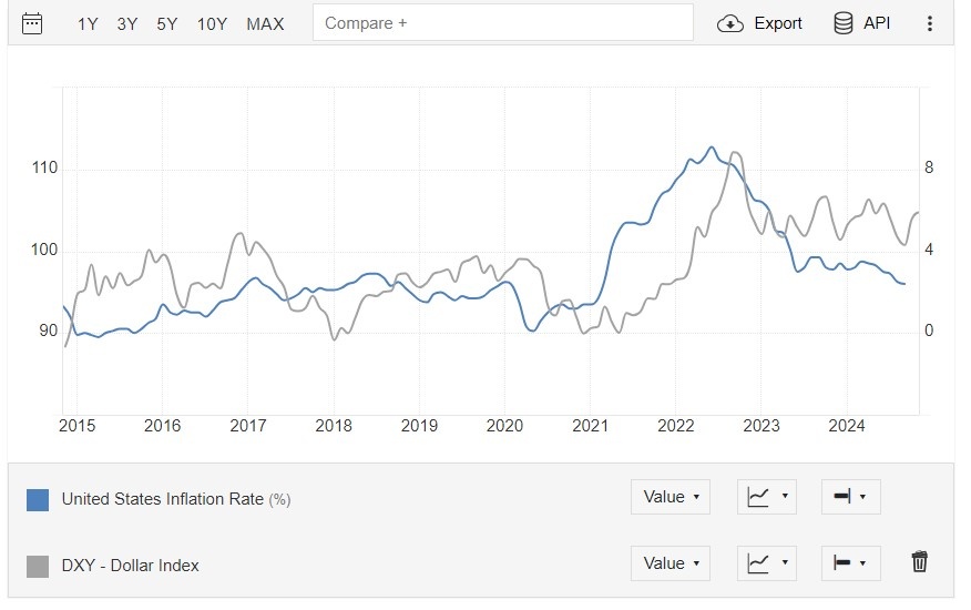 Для начала посмотрите на график, где я сравниваю инфляцию в США и индекс доллара, показывающий его отношение к корзине из других мировых резервных валют, за последние 5 лет.