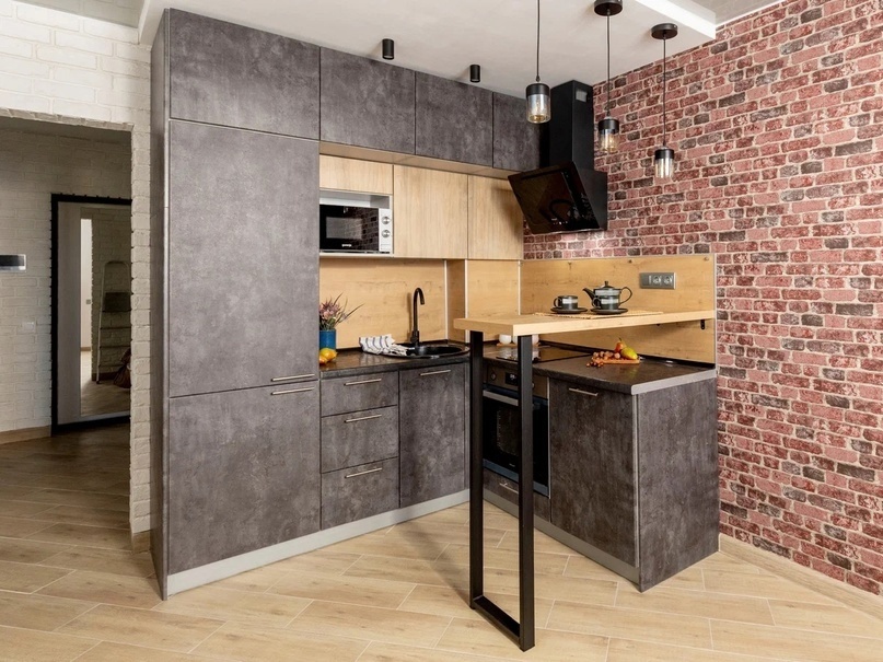 Когда короб выступает слишком сильно, можно использовать метод «от обратного», акцентируя внимание на выступе, сделав его своеобразной изюминкой. Задействовав выступающую вентиляцию, можно разделить кухню на зоны: обеденную и рабочую. ✅ Короб как часть кухни