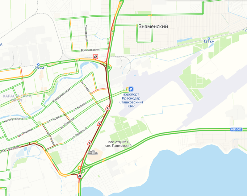 Пробка там растянулась на 7 километров – от посёлка Знаменский до транспортной развязки около «Оз Молла» и района Пашковской переправы. Согласно данным ресурса «Яндекс. Карты», на преодоление этого участка водителям потребуется около одного часа. Скриншот "Яндекс. Карты"