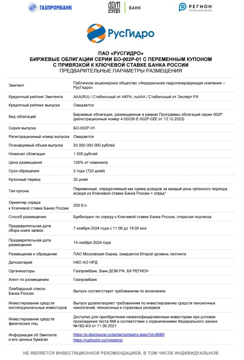 🤝 Доброе утро, друзья, с красным днем календаря :) С началом торгов мы на этой неделе заканчиваем, а вот любопытные первички еще имеются. Ну как любопытные - скорее присмотреться к новым ориентирам премий по рейтингам, участие тут до начала торгов под большим вопросом. ❇️ Должна была быть тройка, но осталось лишь два эмитента, собирающих сегодня заявки: ▶️ РУСГИДРО БО-002Р-01 (🅰️🅰️🅰️) 🔸 Ориентир купона: ΣКС + не выше 2% 🔸Купон плавающий, привязан к КС 🔸 Значение рассчитывается ежедневно 🔸Без оферт и досрочного погашения 🔸 Общий срок обращения - 2 года 🔸 Начало торгов - 14 ноября ▶️ АЛЬФА ЛИЗИНГ БО-02 (🅰️🅰️➖) 🔸 Ориентир купона: ΣКС + не выше 3% 🔸Купон плавающий, привязан к КС 🔸 Значение рассчитывается ежедневно 🔸Без оферт и досрочного погашения 🔸 Общий срок обращения - 3 года 🔸 Начало торгов - 12 ноября ☹️ Третьим должен был стать эмитент КОКС со стартовой премией в рейтинговой группе 🅰️➖ в 4,5% к ключевой, однако сбор перенесен на неделю и теперь состоится 14 но