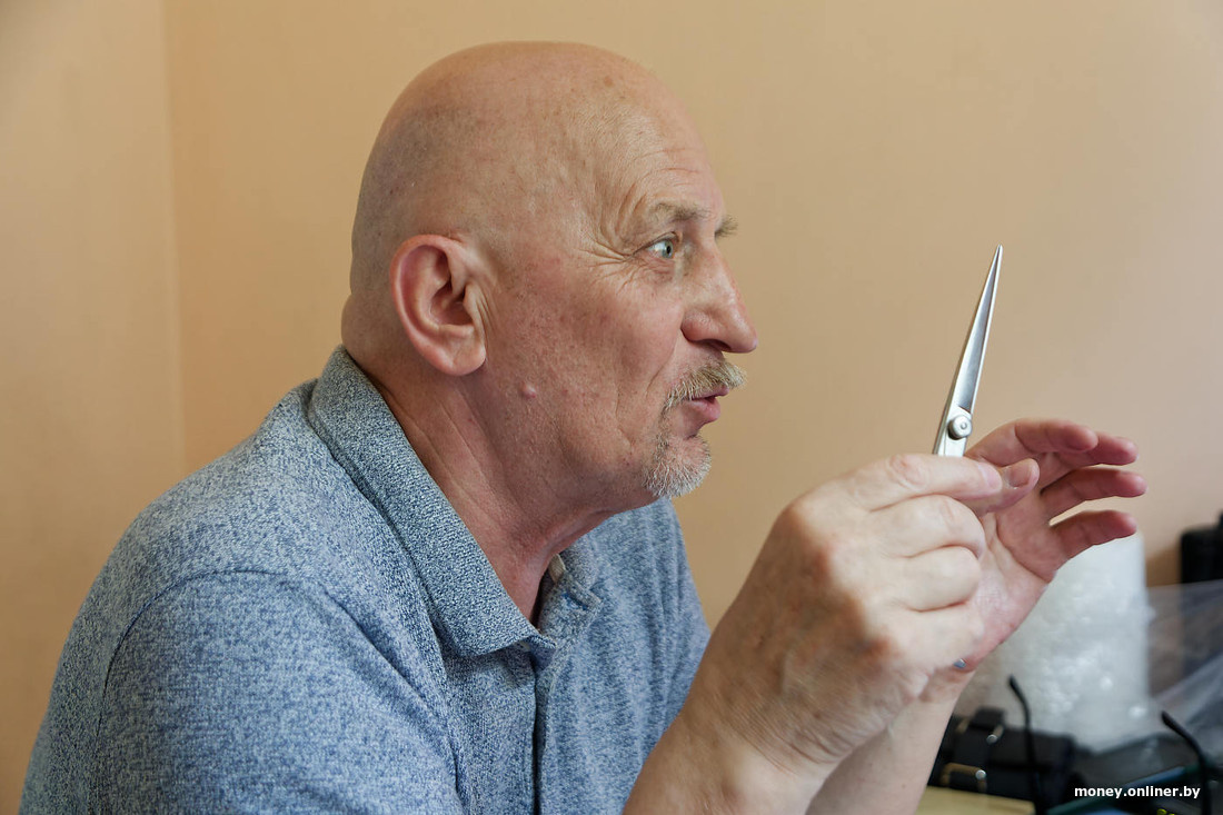 Игорь Щербаков никогда не прекращал заниматься заточкой. В молодости он успел поработать в диско-клубе (был первым директором модного для города места), потом стал предпринимателем, а пять лет назад закрыл свой основной бизнес, и хобби стало его главным занятием. Только теперь к опасным бритвам прибавились еще и парикмахерские ножницы. Говорит, это не про заработок, а больше про удовольствие. В столице некоторые мастера оценивают заточку одной пары ножниц в 50—60 рублей, в Бресте расценки скромнее.