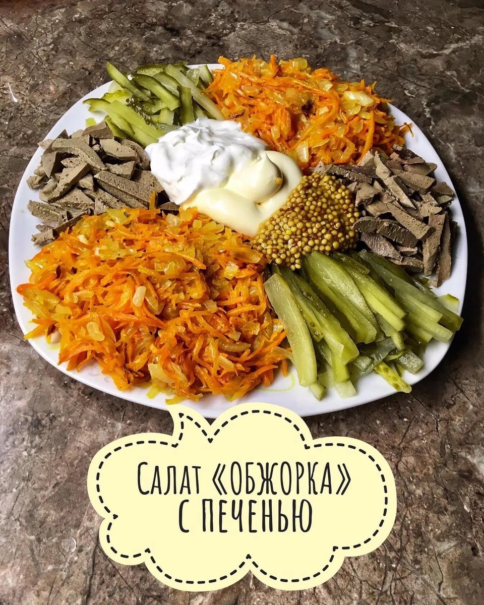 🍂Сытный осенне-зимний салатик. 👩🏻🍳Ингредиенты: Морковь Лук Огурцы солёные Печень отварная Сметана или майонез Дижонская горчица Соль по вкусу 👩🏻🍳Приготовление: 1. Натереть на тёрке морковь, нарезать лук. На небольшом количестве растительного масла обжарить морковь и лук, добавив немного «Вкусной соли». Сильно не зажаривать. 2. Соломкой нарезать отварную печень (отварить до готовности предварительно). 3. Соломкой нарезать консервированные огурцы. 4. Все ингредиенты перемешать, добавить майонез, по желанию немного горчицы и соль по вкусу. Салат готов. Приятного всем!!