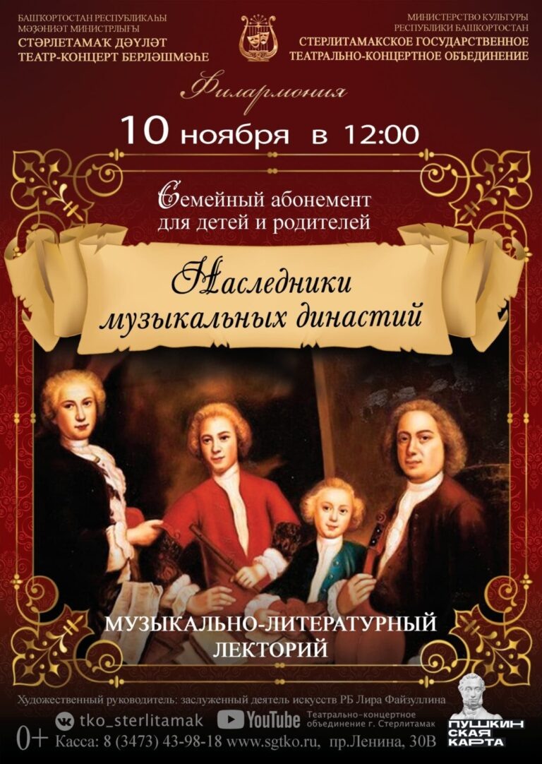 10 ноября 2024г в 12.00 на сцене Стерлитамакского государственного театрально-концертного объединения состоится концертная программа музыкально-литературного лектория филармонии «Наследники музыкальных династий» в рамках семейного абонемента для детей и родителей. Кто-то из мудрецов сказал, что семья – это место приземления для старших, стартовая площадка для младших и маячок взаимоотношений для каждого. Семья – это родство не только кровное, но и духовное, это общность или близость интересов. Существует немало профессий, где преемственность поколений играет положительную роль, помогает добиваться наилучших результатов. Как часто в биографиях великих музыкантов мы читаем «рос в музыкальной семье», «талант передавался из поколения в поколение». В рамках семейного абонемента для детей и родителей музыкально-литературный лекторий подготовил новую программу «Наследие музыкальных династий» о всемирно известных музыкальных династиях, в которой прозвучали произведения семейных династий Бахов,