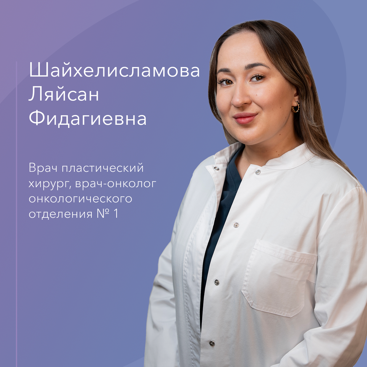 Дорогие друзья! Рады сообщить вам о том, что штат Клиники расширяется. Ляйсан Фидагиевна — грамотный специалист и отзывчивый человек. Она непрерывно совершенствует своё мастерство — за три года практической работы закончила ординатуру по онкологии и интернатуру по пластической хирургии, а также стала участником многих крупных научно-практических конференций.