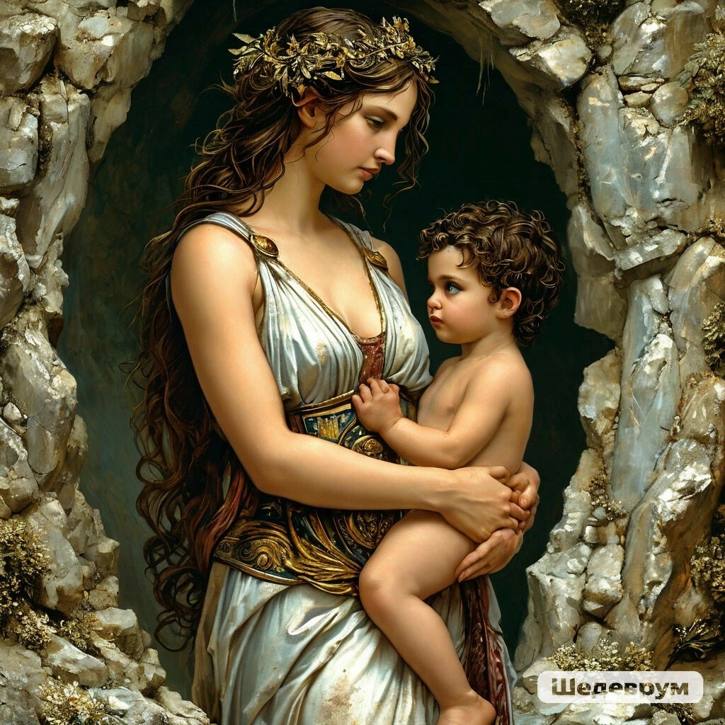 На вершинах высоких гор, окутанных вечными снегами, где воздух чист и прозрачен, как хрусталь, родился Зевс, царь богов и повелитель Олимпа. Его происхождение окутано тайной и магией, ибо он был сыном Кроноса, титана, пожирающего своих детей, и Реи, великой матери богов. Но Зевсу удалось избежать страшной участи своих братьев и сестёр благодаря хитрости и смелости его матери. Рея спрятала младенца в пещере на острове Крит, где его вырастили нимфы и козья богиня Амалфея. Когда Зевс вырос, он вернулся к своему отцу, чтобы бросить вызов его власти. В этой великой битве, известной как Титаномахия, Зевс возглавил армию олимпийских богов против титанов. После долгих лет войны Зевс одержал победу и низверг Кроноса в Тартар, мрачный подземный мир. Таким образом, он стал верховным богом, властителем неба и земли, держащим в руках судьбу всех живых существ. Внешность Зевса была поистине величественной. Его волосы, чёрные как ночь, падали на широкие плечи, словно каскад густого бархата, переливаю