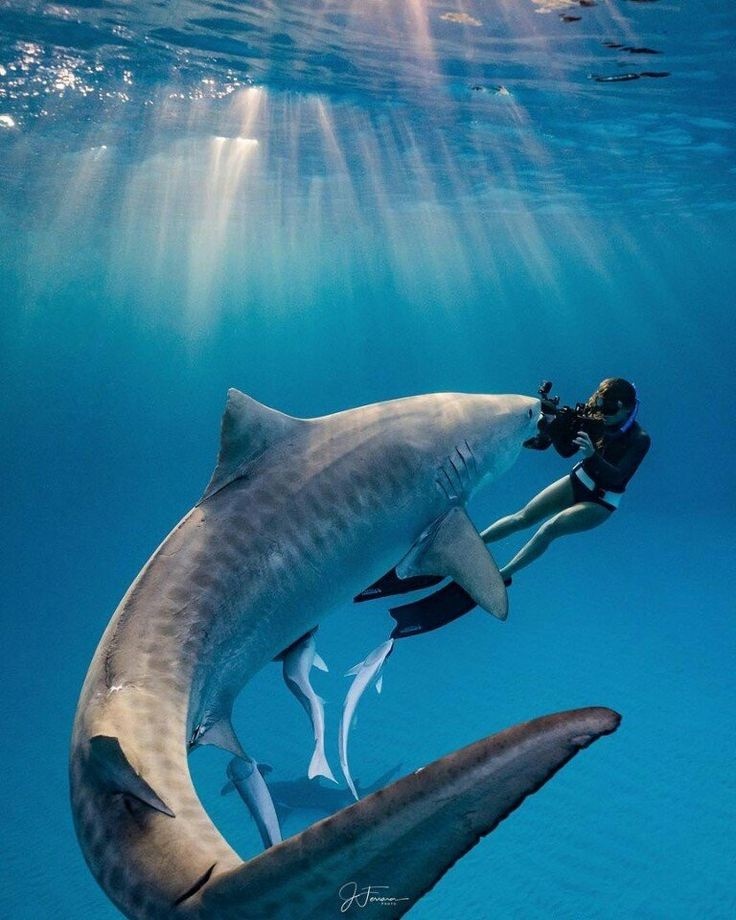 Тигровая акула (Galeocerdo cuvier) — одна из самых крупных и известных акул в мире, которая привлекает внимание как своими размерами, так и характерным поведением. Вот несколько интересных фактов о тигровых акулах: 1. Уникальный внешний вид и полосы Тигровые акулы получили своё название благодаря характерным тёмным полосам на теле, которые напоминают тигриный окрас. Эти полосы особенно выражены у молодых особей и с возрастом постепенно тускнеют, но никогда не исчезают полностью. Окраска помогает акулам маскироваться в водах, где встречаются как светлые участки, так и темные тени от волн или морских растений. 2. Одни из самых крупных хищников в океане Тигровая акула — одна из самых крупных акул, достигающая длины до 5 метров и массы более 900 килограмм. Это делает её одним из самых опасных хищников в океанах. Она может плавать на глубине до 700 метров, однако чаще всего встречается в прибрежных водах. 3. Всеядность и разнообразие рациона Тигровые акулы — настоящие всеядные хищник