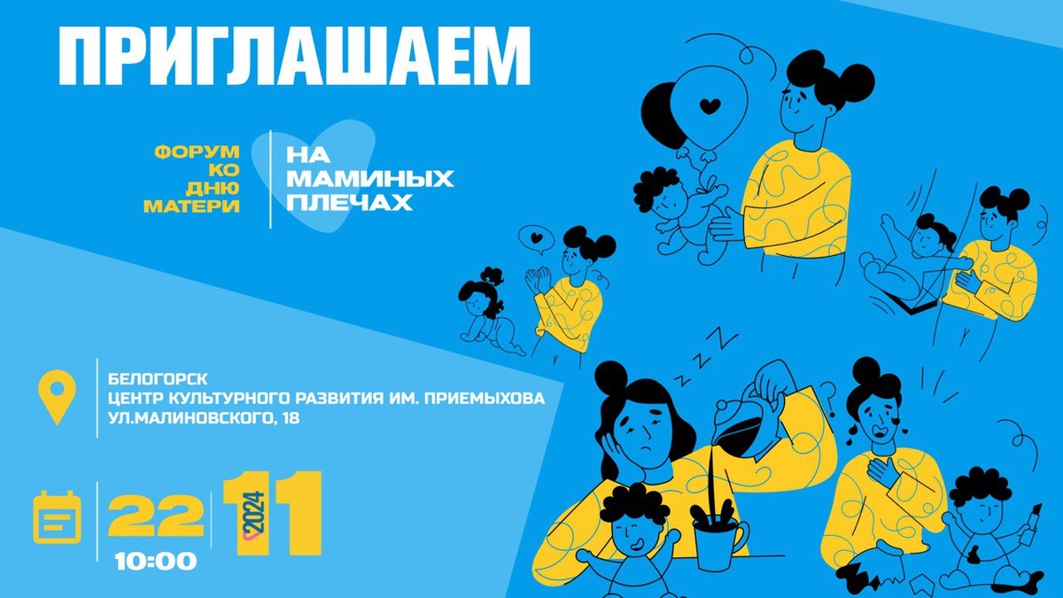 24 ноября в России отпразднуют День матери. В преддверии праздника в Белогорске состоится открытый форум «На маминых плечах». Организаторами мероприятия выступили: комитет по образованию и делам молодежи, профсоюз эксплуатационного локомотивного депо, городской Советом отцов. Этот форум – уникальная возможность для всех мам встретиться, обменяться опытом, узнать больше о воспитании подростков, современных подходах к материнству и его успешном совмещении с работой. — В программе форума – кинолекторий по теме: «Как родителям выстраивать доверительные отношения с подростком», встречи с мамами, которые смогли совместить карьеру и материнство, построили бизнес, добились успеха в профессии, — рассказала начальник отдела по делам молодежи и воспитательной работе Анжела Литвинюк. — Также в мероприятии будет организованы площадки, посвященные красоте и уходу за собой. Кроме того, участники смогут пообщаться с другими мамами, найти новых друзей и единомышленников, а также получить ценные советы