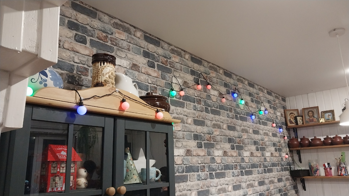 Украшаем дом к Новому году. Много поделок делать, пока всё закончим, как раз. Приходит новогоднее настроение понемногу, девчонкам очень нравятся гирлянды. Долго смотрят, как мигают.