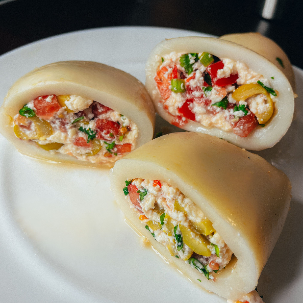 Привет, читатель! Сегодня предлагаю вашему вниманию пикантную и не сложную начинку для кальмара. Очень вкусно получается :) Нам понадобится: В качестве альтернативы адыгейскому сыру можно использовать фетаксу, сиртаки или брынзу. Начнем с подготовки кальмара: даже если он уже очищен, не забудьте удалить пленочку с внешней стороны тушки. Теперь займемся начинкой: мелко нарежьте помидор кубиками, измельчите зелень и сыр, а оливки нарежьте колечками. Все ингредиенты смешайте в миске. Затем нафаршируйте кальмара полученной смесью, закрепите начинку зубочистками и отправьте в разогретую духовку примерно на 25 минут. КБЖУ на 100г: Ккал 107.92 Б 15.40 Ж 4.06 У 1.96