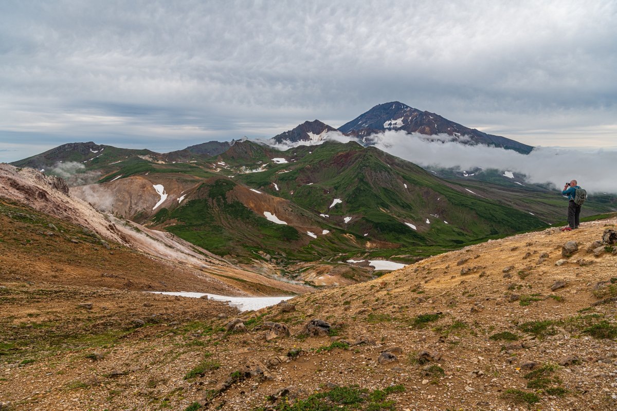 Мы провели в тех краях три дня, встав лагерем возле термального поля на краю Камбального хребта. И первый мой рассказ – про него, про этот самый хребет. По нему можно прогуляться – это примерно 8 км по прямой в одну сторону, то есть со всеми изгибами и поворотами километров 12. Ну и вверх-вниз тоже придется пошагать. Но картинки покажут – закачаешься!