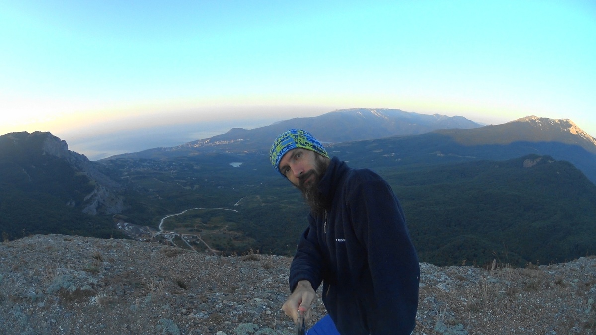 Вроде бы маршрут небольшой всего 25 км за два дня, а как оказалось маршрут с сюрпризом что мы увидим в конце. Начало похода высаживаемся на перевале и вечером и топаем до первой стоянки на козырьке. Как обычно в сумерках немного сбился с пути и пришлось кружлять вместо двух часов поднялся за 3 часа на скалу Козырёк - стоянка на южной Демерджи. Виды с неё открываются отличные по пути можно вдали увидеть огоньки Симферополя с одной стороны а с другой огни Алушты и море. Как обычно ночью на высоте с моря дует постоянный ветер поэтому наблюдать за огоньками не очень комфортно зато на стоянке тишина и спокойствие можно спокойно переночевать до утра. Утром с свежими силами начинаем наше путешествие к Джур Джуру. Встал с рассветом чтобы поймать линию солнца вон вдали солнце идёт по горам. Вот наша стоянка вид сверху вот я показываю пальцем на Чатырдаг что в переводе означает гора шатёр, правда ведь похож на палатку? На подходе к знаменитой скале "голова Екатерины" Со скалы открывается вид, хо
