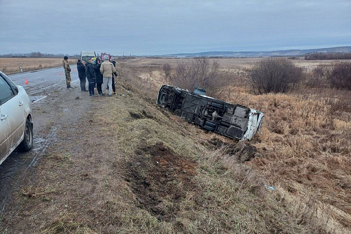 Автобус двигался со стороны Красноярска и вёз рабочих. Установлено, что водитель автобуса, принадлежащего компании «Сибагро», не справился с управлением, съехал в кювет и опрокинулся набок.