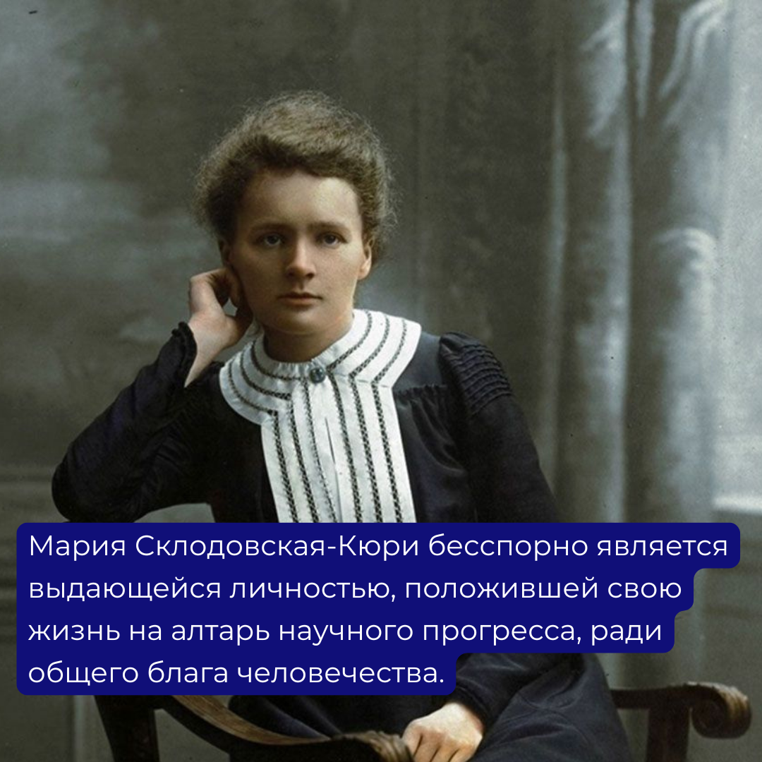 Мария Склодовская-Кюри бесспорно является выдающейся личностью, положившей свою жизнь на алтарь научного прогресса, ради общего блага человечества.