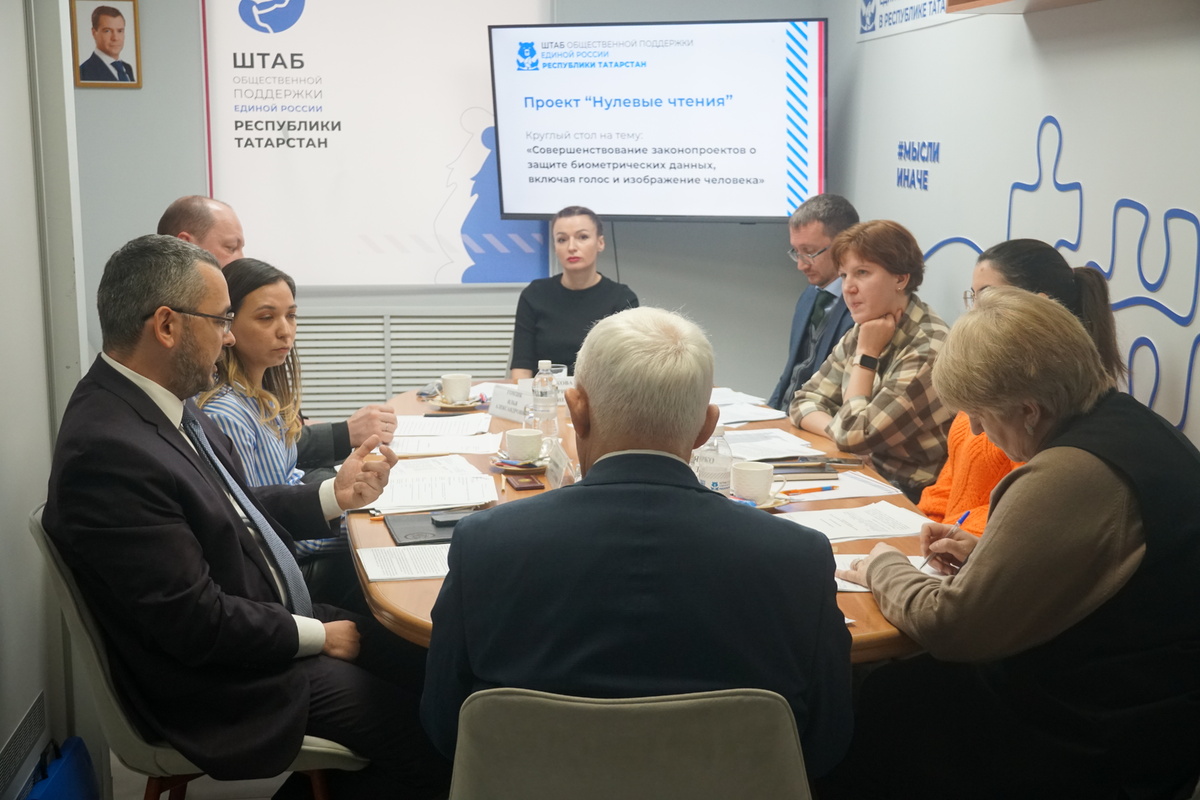 Сегодня в Штабе общественной поддержки «Единой России» в Республике Татарстан стартовал новый проект под названием «Нулевые чтения», направленный на развитие общественных обсуждений федеральных законопроектов. В рамках проекта состоялся круглый стол, посвященный совершенствованию законопроектов о защите биометрических данных, таких как голос и изображение граждан. На мероприятии присутствовали эксперты: руководитель Штаба общественной поддержки «Единой России» в Республике Татарстан Камиль Садриев, юрист Штаба общественной поддержки «Единой России» в Республике Татарстан Екатерина Корюкова, первый заместитель министра юстиции Республики Татарстан Илья Гомзик, заместитель начальника Правового управления Аппарата Государственного Совета Республики Татарстан Дамир Махмутов, заместитель начальника отдела по вопросам восстановления прав граждан Аппарата Уполномоченного по правам человека в Республике Татарстан Эльмира Хабибуллина, ведущий советник отдела правового обеспечения Министерства